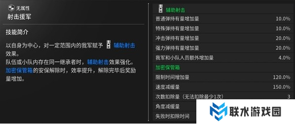辅助射击:以恩佐为中心,对一定范围内的我军赋予辅助射击效果,增加最大子弹持有量。根据小队内恩佐的人数,该效果的效率会有小幅提升。
