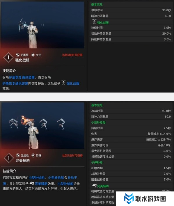 ④完美辅助(特殊):召唤我军和自己的小型补给船。小型补给船会定期补给弹药,并对我军赋予完美辅助效果。小型补给船在持续时间内攻击前方的敌人,结束时向前方发射**,在目的地引起大爆炸。