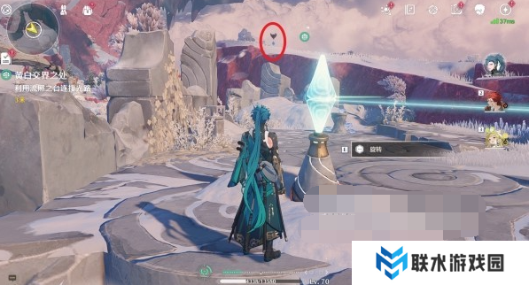 7、来到刚才点亮的机关柱前,往岩石上方看,旋转3次机关点亮最后的珠子。