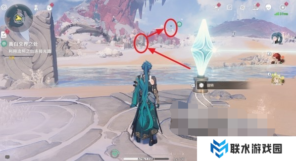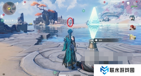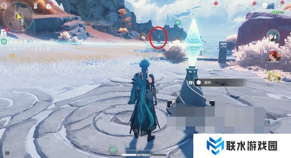 4、站在第二个机关柱位置往小地图西北边看(视角左转),可以在对面海边的废墟前看到下一个机关柱,旋转1次让光线把对面机关柱照亮。