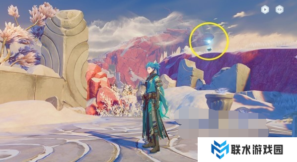 6、继续来到刚才点亮的机关柱处,往地图东南边(右下角)看到对面废墟石柱前的机关柱,旋转2次点亮。再往岩石上方看能看到这个光线的终点。