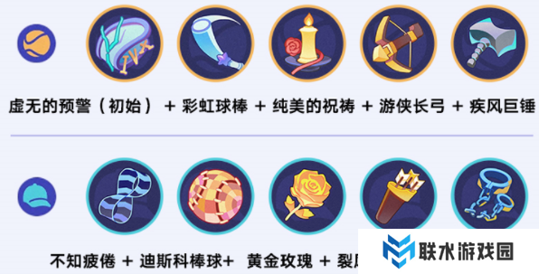 武器组合:虚无的预警(初始)+彩虹球棒+纯美的祝祷+游侠长弓+疾风巨锤