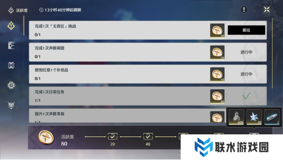 完成每日活跃可以获得10+10+10+10+20=60星声