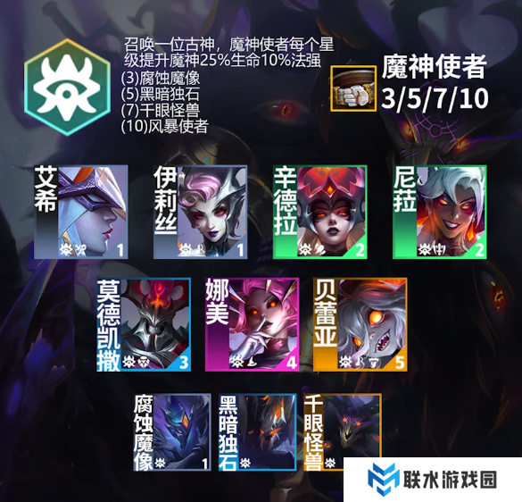 棋子:艾希、伊莉丝、辛德拉、尼菈、莫德凯撒、娜美、贝雷塔亚、复试魔像、黑暗独石、千眼怪兽
