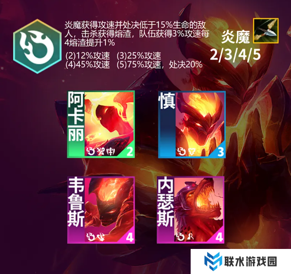 炎魔获得攻速并处决低于15%生命的敌人,击杀获得熔渣,队伍获得3%攻速每4熔渣提升1%。