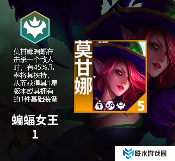 莫甘娜蝙蝠在击杀一个敌人时,有45%几率将其挟持,从而获得其1星版本或其拥有的1件基础装备。