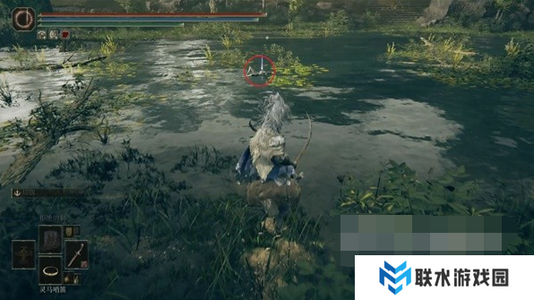 4、在湖面的正中央即可看到一个尸体上的光点,拾取光点获得祷告【神鸟羽毛】。