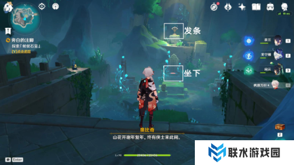 4、往地图的北方向走,可以来到「候侯石室」位置,在前方交互石座“坐下”,左下会等待对话,然后交互中间平台“阅读”;