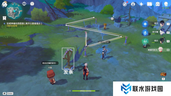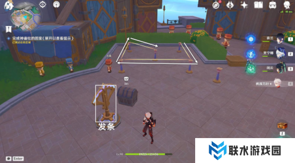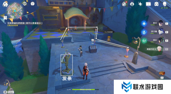 9、交付之后去攻击发条,直至神谕柱上升至最高位置,之后按下图中指引方向连接图案,就可以获得精致的宝箱①(注意:攻击神谕柱可重置连线);