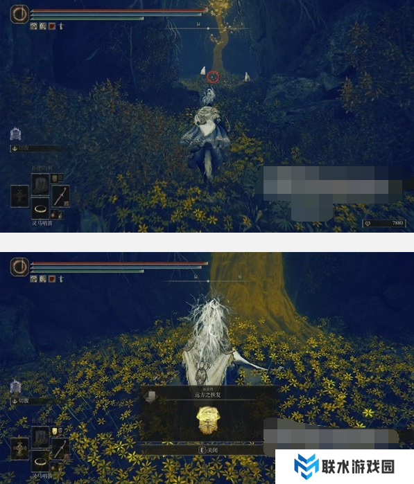 2、进入洞穴走不了多远就能看到一个小黄金树,击败周围的三个调香师并拾取前方的光点即可获得祷告【远方之恢复】。