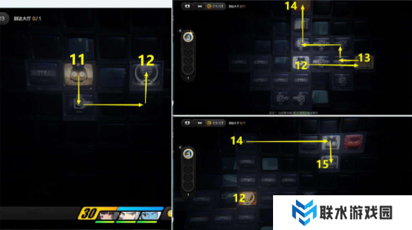 4、接着从11区域去12区域开灯,接着去13区域拿了宝箱后去上面14区域,然后从15区域轨道去16区域;