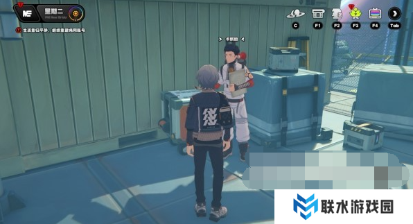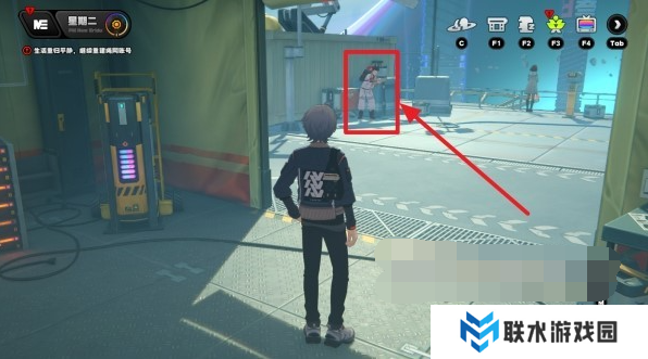 2、到这里之后转身往帐篷外面看,可以看到墙边站着一个NPC。