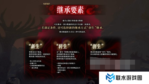 继承要素中增添了新的继承方式【创生】。在通关正篇后读取通关数据可在继承一部分数据的状态下开启新一轮游戏,新增的【创生】继承要素与【转生相同】,但出现的敌方恶魔将得到大幅强化。商店里还会出售相关辅助道具。推荐给希望通过残酷的战斗获得全新游玩体验的玩家。
