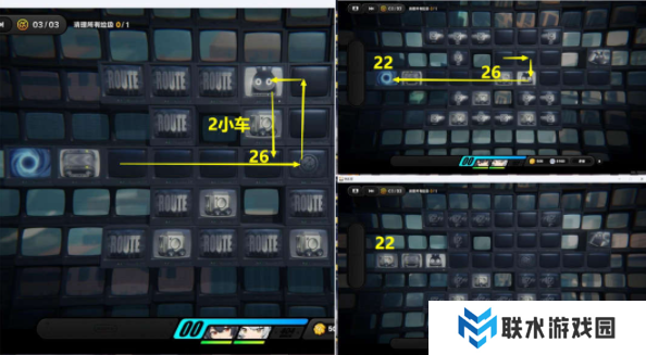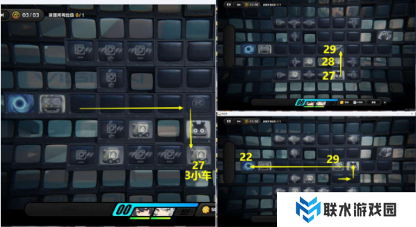 10、接着往27区域走,就会自动将3小车换到上面28区域,接着再将3小车推到29区域后,再从29区域右边即可将3小车推进22区域里面;