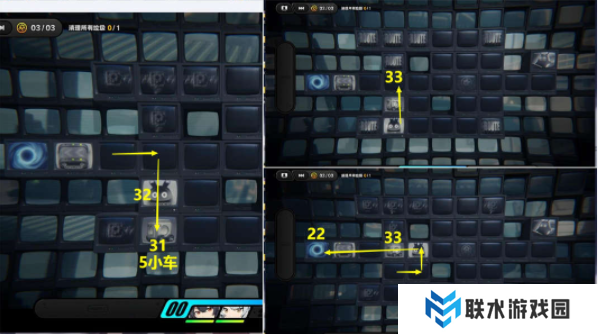 12、接着往31区域走,就会自动将5小车换到上面32区域,接着再将5小车推到33区域后,再从33区域右边即可将5小车推进22区域里面;