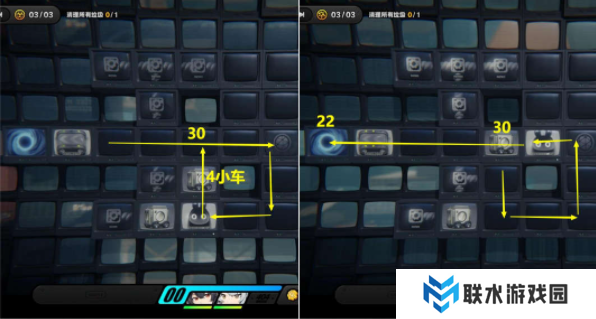 11、接着将4小车推到30区域后,再从30区域右边即可将4小车推进22区域里面;