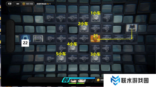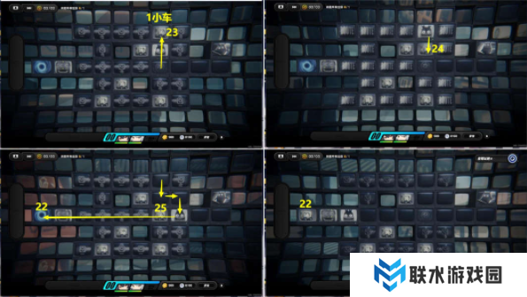 8、首先往23区域走,就会自动将1小车换到下面24区域,接着再将1小车推到25区域后,再从25区域右边即可将1小车推进22区域里面;