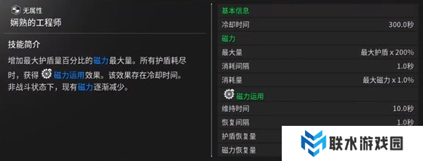 ③释放磁力(次元):受到伤害时将消耗磁力来代替生命力及护盾。一定时间后引爆磁力,对自身周围造成伤害。