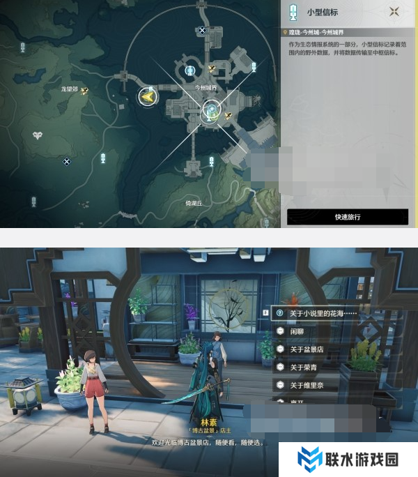 3、传送到今州城界地图下方信标,与盆景店主林素对话。