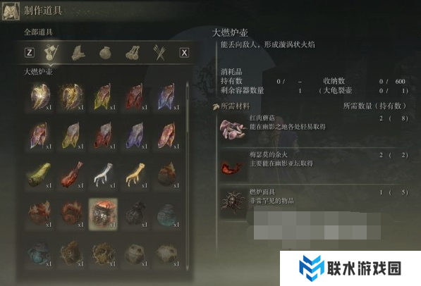 3、打开菜单选择【制作道具】,找到大燃炉壶,消耗红肉蘑菇×2、梅瑟莫的余火×2、燃炉面具×1即可制作。红肉蘑菇可以在幽影之地拾取,梅瑟莫的余火在幽影城周围区域的地面上可以拾取到(例如幽影城正门前)。