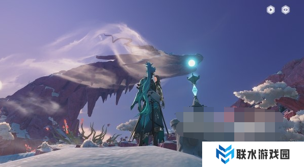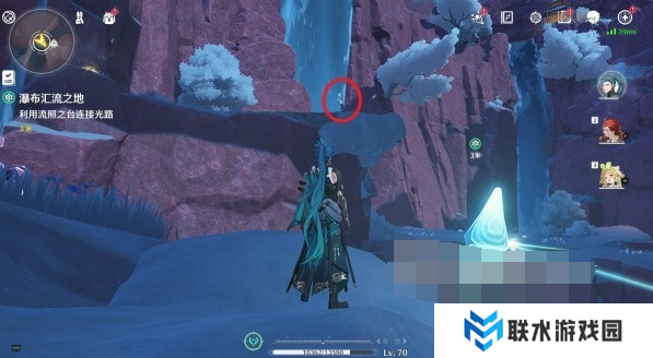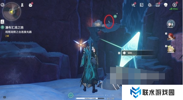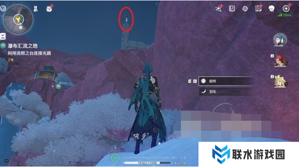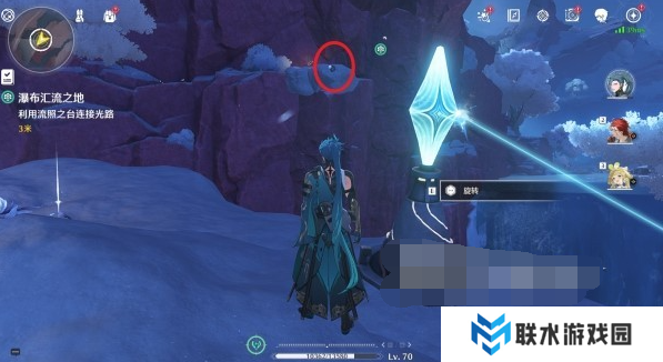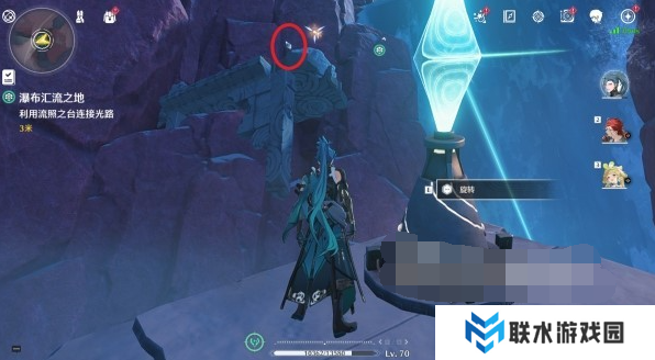 4、跟随光线离开瀑布,站在光线尽头,往地图西南边(左下角)抬头看,下一个机关在上层,旋转3次点亮。