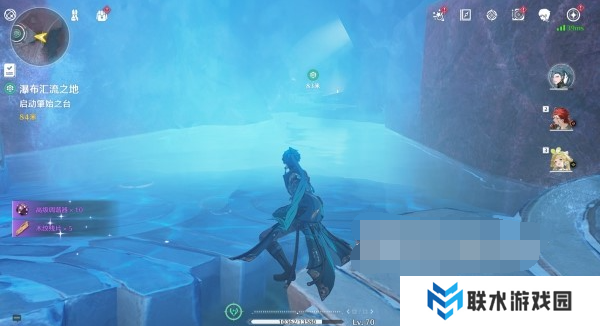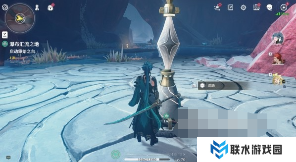 6、使用跳台继续到达刚才点亮的机关柱所在位置,往地图东南边(右下角)上方看,下一个机关柱就在瀑布前,旋转3次点亮。