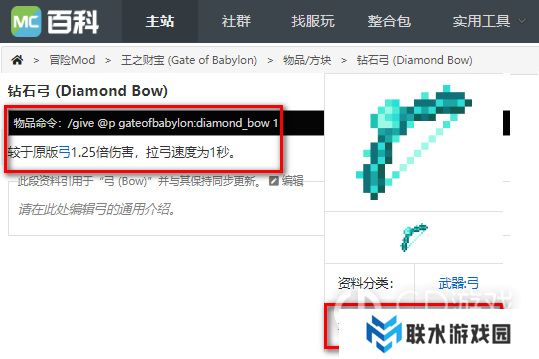 钻石弓的最大耐久为1560。可以造成原版弓的1.25倍伤害,拉弓速度为1秒。/give @p gateofbabylon:diamond_bow 1。