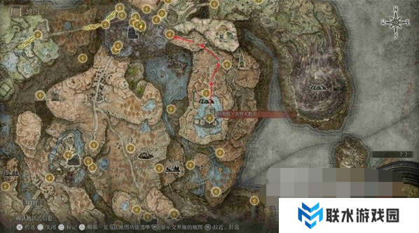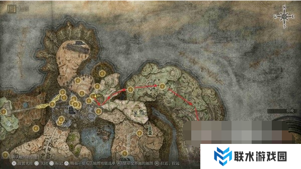 15、赐福【隐匿之地】出发按照下图路线依次激活【隐匿之地(桥边)】与【指岩山丘】两个赐福,继续往右下的【狄欧指头遗迹】走。