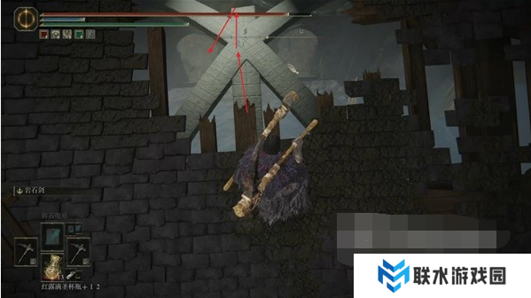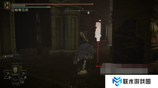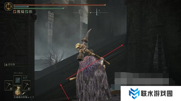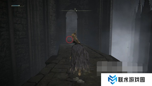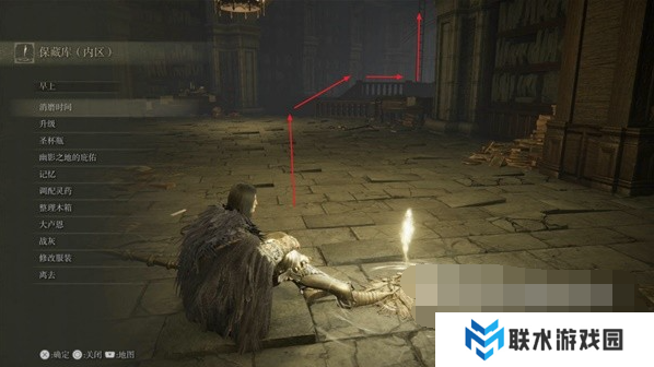 8、爬到第三层的位置,先走到前方小门的位置,此时往右后方看,通过此处的出口走到外侧楼梯,沿着楼梯爬到上层激活赐福【保藏库(阁楼)】。