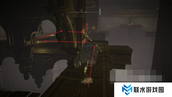 9、乘坐这个赐福旁边的升降梯上去,升降梯停下后走到前方木横梁的位置往左走,沿着下图路线爬第一个楼梯。