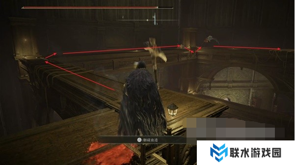 10、来到横梁上层沿着下图路线继续在横梁上走,注意右侧第二个拐角位置需要跳一下,如果掉下去还得重新按照刚才的路线跑一遍。
