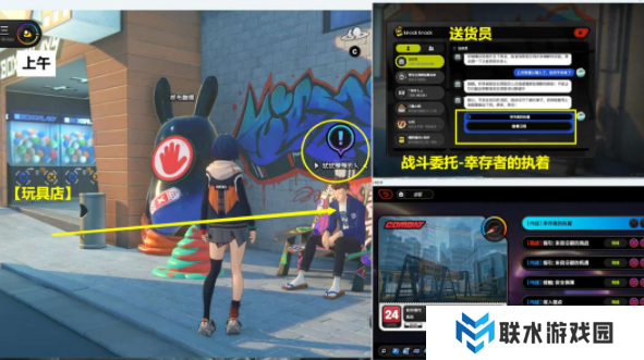 2、然后等大概25级时,游戏上午时间段,传送到【玩具店】下图位置和出现的【犹犹豫豫的人】对话后,会收到【送货员】的短信,阅读短信后可接到第2个前置任务【战斗委托-幸存者执着】,很简单进去打怪就行。