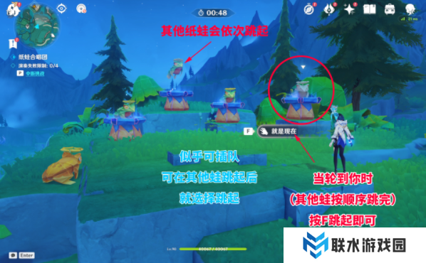 2、其他纸蛙会依次跳起,你需要在其他蛙按顺序跳完后选择跳起(*似乎可以插队);