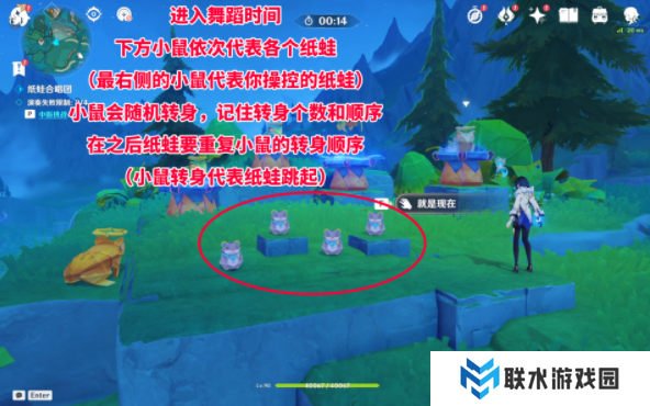 下方小鼠依次代表各个纸蛙(最右侧的小鼠代表你操控的纸蛙),小鼠会随机转身,记住转身个数和顺序,在之后纸蛙要重复小鼠的转身顺序(小鼠转身代表纸蛙跳起)。