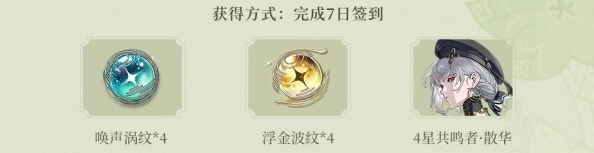 完成7日签到获得唤声涡纹×4、浮金波纹×4、4星共鸣者·散华