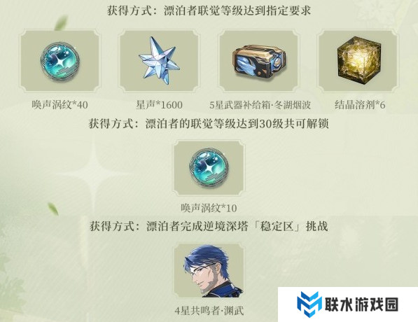 【初醒之征程】漂泊者联觉等级达到指定要求,可获得唤声涡纹×40、星声×1600、5星武器补给箱·冬湖烟波、结晶溶剂×6