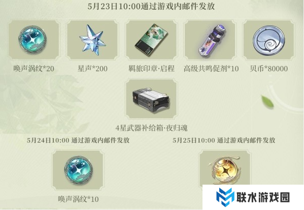 漂泊者们可在游戏内累计免费获取84枚唤声涡纹、14枚浮金波纹、1800枚星声,以及自选5星武器、自选4星武器、羁旅印章·启程、4星共鸣者·散华、4星共鸣者·渊武等珍贵奖励。