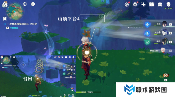 前往山顶平台4,显示轨迹穿过所有花环,点按攻击召回。