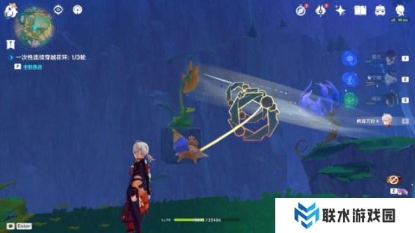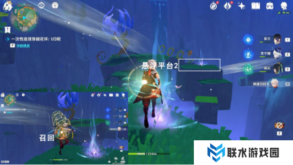 前往悬浮平台2,显示轨迹穿过所有花环,点按攻击召回。