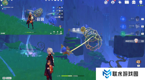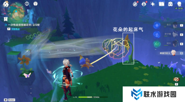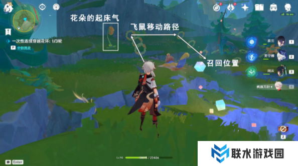 长按攻击,显示轨迹穿过花朵的起床气,长按攻击,显示轨迹穿过所有花环,前往召回位置,显示轨迹穿过所有花环,点按攻击召回。
