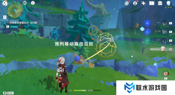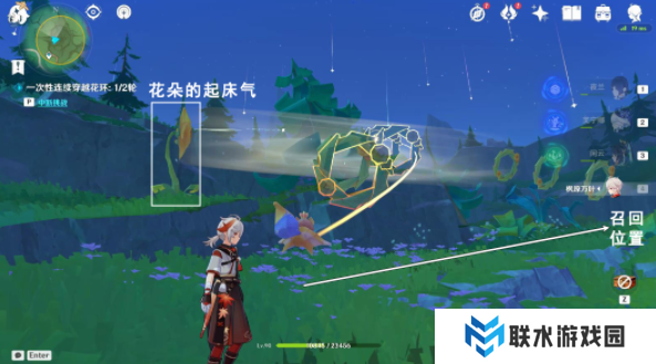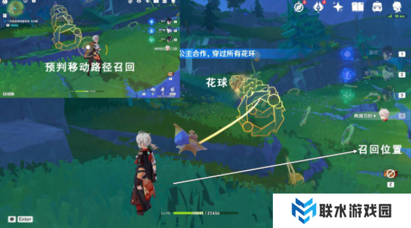 长按攻击,显示轨迹穿过花朵的起床气,之后长按攻击,显示轨迹穿过所有花环,然后前往召回位置,显示轨迹穿过所有花环,点按攻击召回。