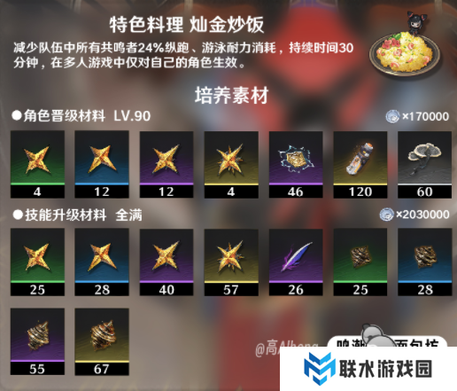【灿金炒饭】:减少队伍中所有共鸣者24%纵跑、游泳耐力消耗,持续时间30分钟,在多人游戏中仅对自己的角色生效。