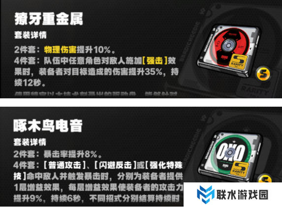 物理角色带獠牙重金属(物理套装),再加上啄木鸟电音二件套(加暴击),就很不错,二件套也可按需选择,看你需要能量,还是攻击,还是暴击暴伤。