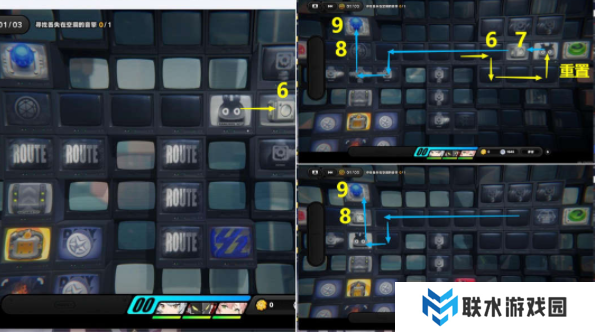 5、接着从下面过去,将7区域的箱子推到9区域,如果推错了,右边绿色按钮为重置按钮;