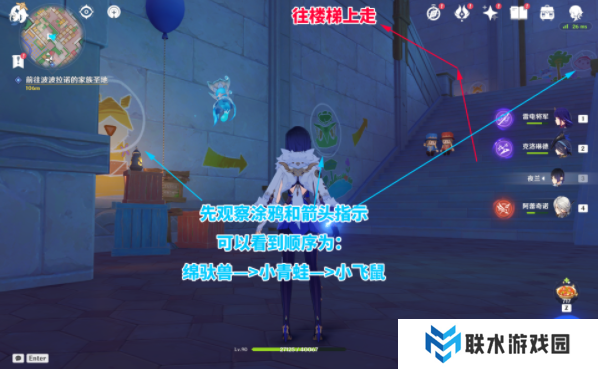 2、先观察涂鸦和箭头指示,可以看到顺序为:绵驮兽—>小青蛙—>小飞鼠