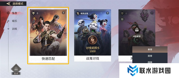 2、然后选择游戏模式为【快速匹配】,点击右下角【单排】可选择组队方式;
