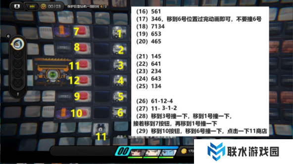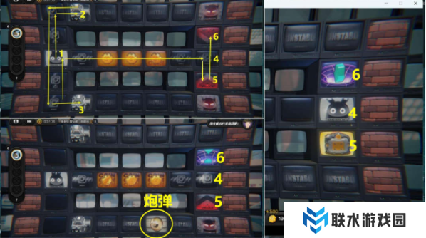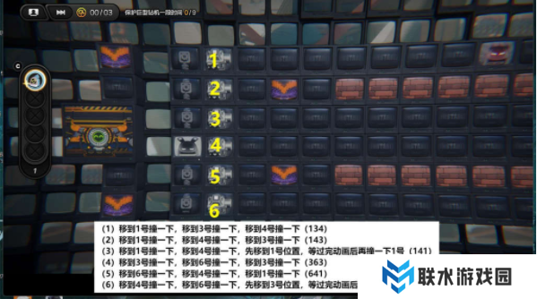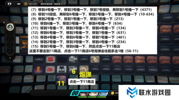 3、下来会有6个坦克(编号1-6),需要打右边区域不断出现的怪,这里大家需要完全按照我下面的步骤走,不要多走或者少走,不然后面会拿不全宝箱(需要无伤),每个坦克都是需要往右撞一下后就会发射一枚炮弹,炮弹会随着我们上下的移动而前进(答案不唯一,也可自行尝试,只要左上角进度到9/9即可完成解密)。