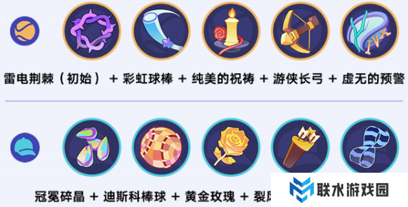 武器组合:雷电荆棘(初始)+彩虹球棒+纯美的祝祷+游侠长弓+虚无的预警