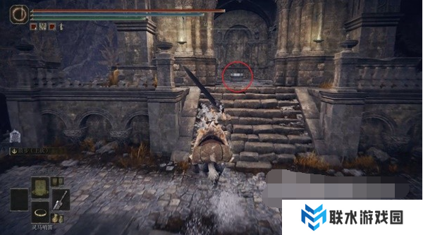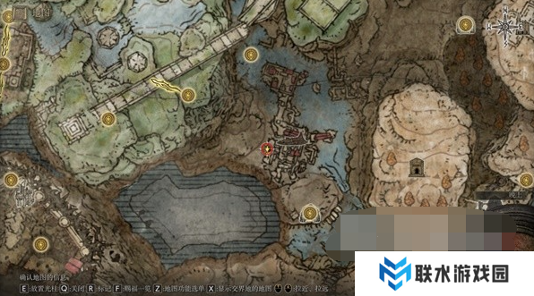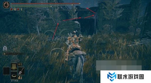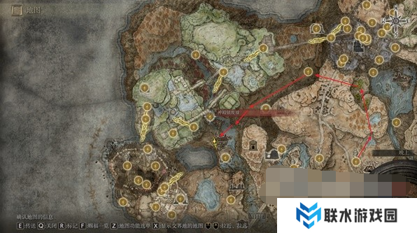 2、按照下图路线从【穆斯废墟】出发经过【古遗迹下方】赐福继续往地图左下走即可到达。