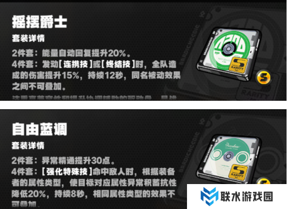 建议带摇摆爵士四件套,连携或大招后的全队伤害提升比较通用,理论上自由蓝调四件套也可以用,但通用性没摇摆爵士高,其次即使是在感电队,让格莉丝带自由蓝调,丽娜摇摆爵士,这样效果更好。